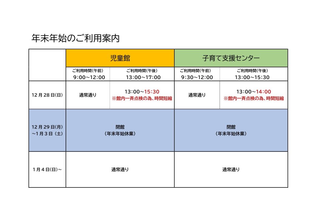 年末年始の開館日・ご利用時間が以下の通り変更になっております👇